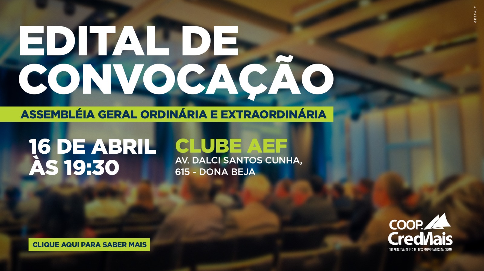 O Presidente do Conselho de Administração da Cooperativa de Economia e Crédito Mútuo dos Empregados da CBMM Ltda, usando das atribuições conferidas pelo Estatuto Social, convoca os 2.416 (Dois mil quatrocentos e dezesseis) cooperados para se reunirem em Assembleia Geral Extraordinária e Ordinária, a realizar-se no dia 16 de abril de 2025. A Assembleia ocorrerá de forma PRESENCIAL no clube AEF (Associação dos empregados da Fosfertil) sito Av. Dalci Santos Cunha 615 – Bairro Dona Beja– na cidade de Araxá, Estado de Minas Gerais, e será transmitida também de forma VIRTUAL por intermédio do aplicativo Youtube disponível para todos os nossos cooperados. A votação da pauta da Assembleia será realizada pela plataforma Curia. O evento terá início em primeira convocação às 17:30 horas, com a presença de 2/3 (dois terços) do número total de associados. Caso não haja número legal para a instalação ficam desde já convocados para a segunda convocação às 18:30 horas, no mesmo dia e local com a presença de metade e mais um do número total de associados. Persistindo a falta de “quórum legal”, a Assembleia realizar-se-á, então, no mesmo dia e local, em terceira e última convocação às 19:30 horas, com a presença de no mínimo 10 (dez) associados, a fim de deliberarem sobre a seguinte ordem do dia: